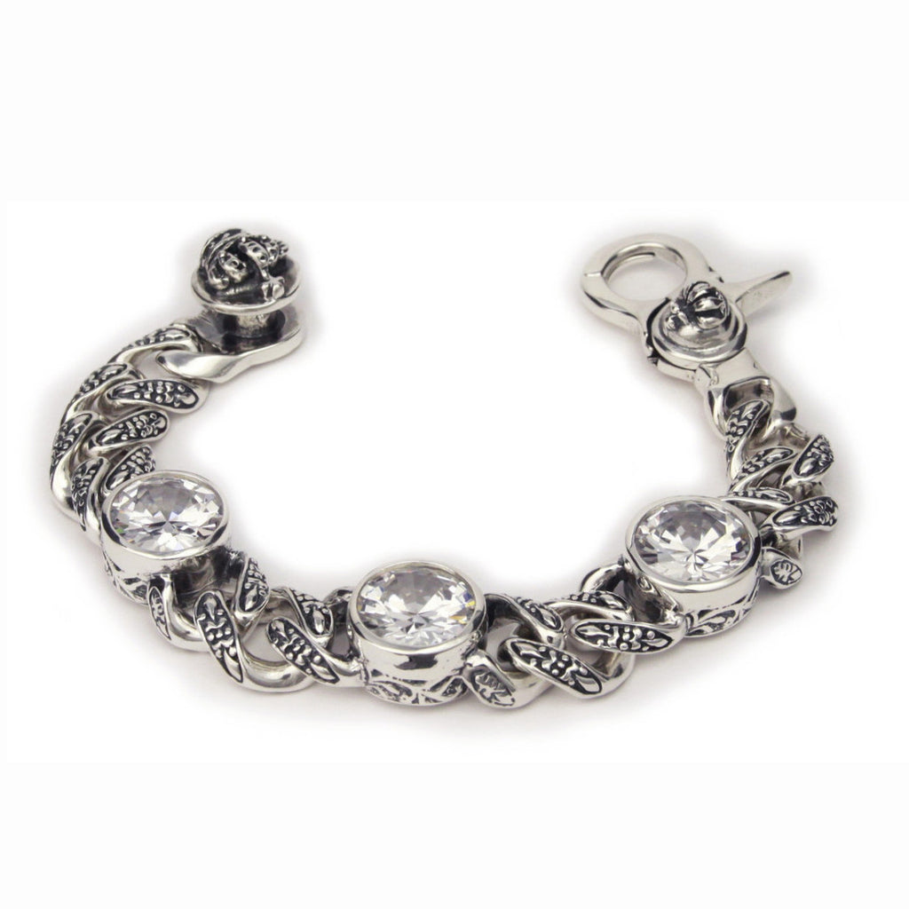 Tribal link bracelet set with three cubic zirconia stones. Ornate carvings on each link as well as on the GOD Clip.
