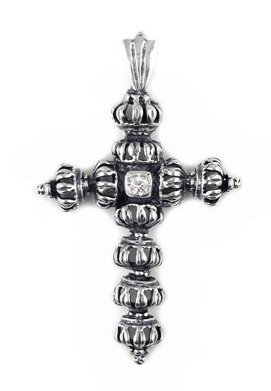 Repeat crown cross pendant set with a white or black diamond, a ruby, or sapphire.