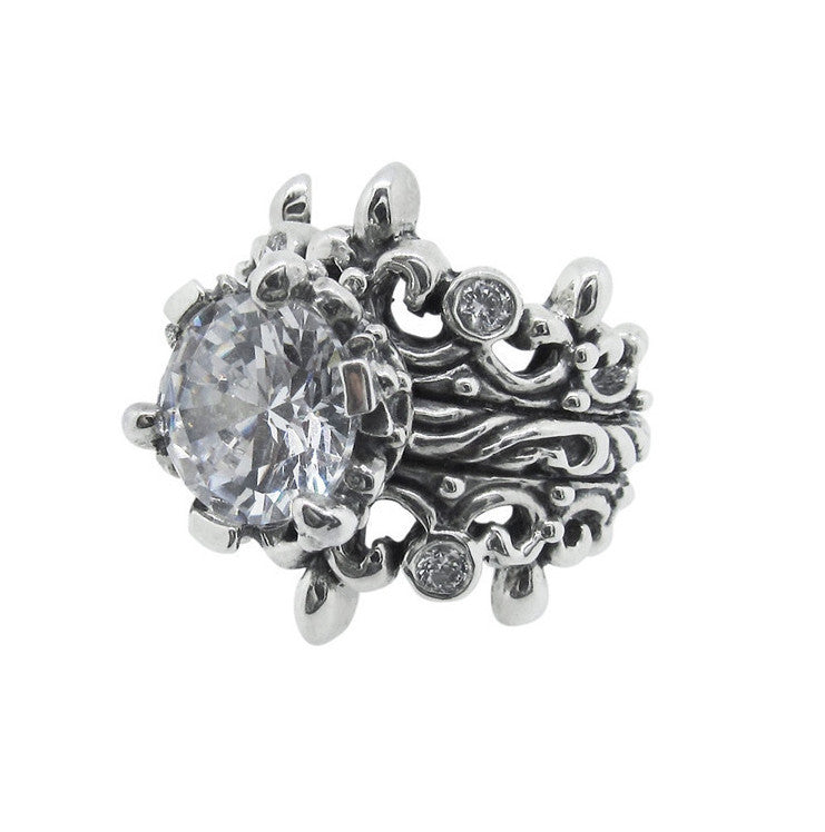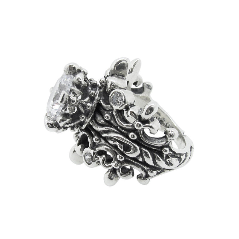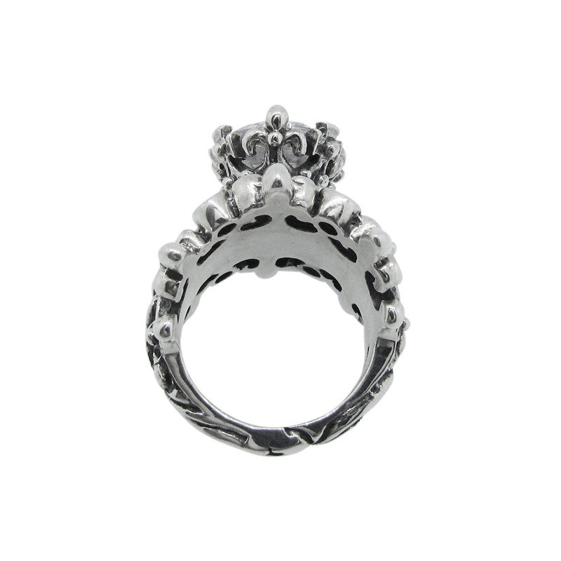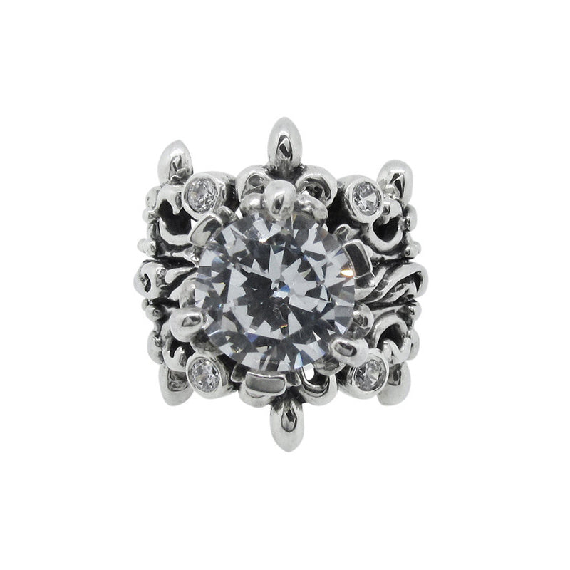 Double tiara fleur de lis ribbon band with 4 cubic zirconia. One large center cubic zirconia in crown.