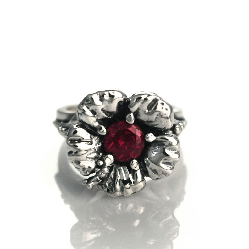 Silver hibiscus ring with cubic zirconia.