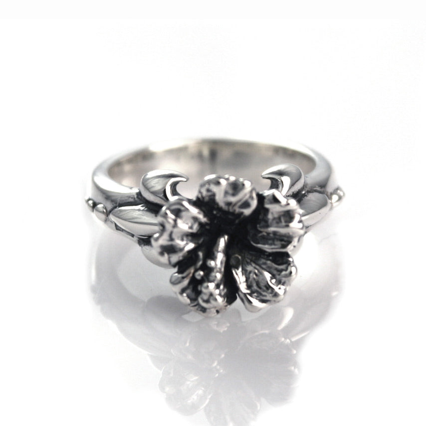 Small hibiscus with petite leaves on Fleur des Lis band.