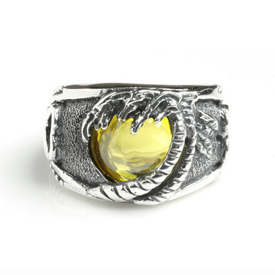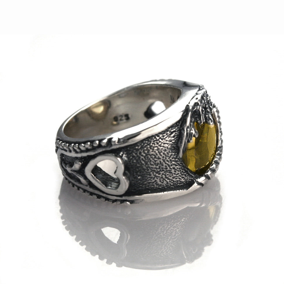 Palm trees frame a cabochon-cut cubic zirconia stone, and a heart-shaped opening carved on each side of the ring.