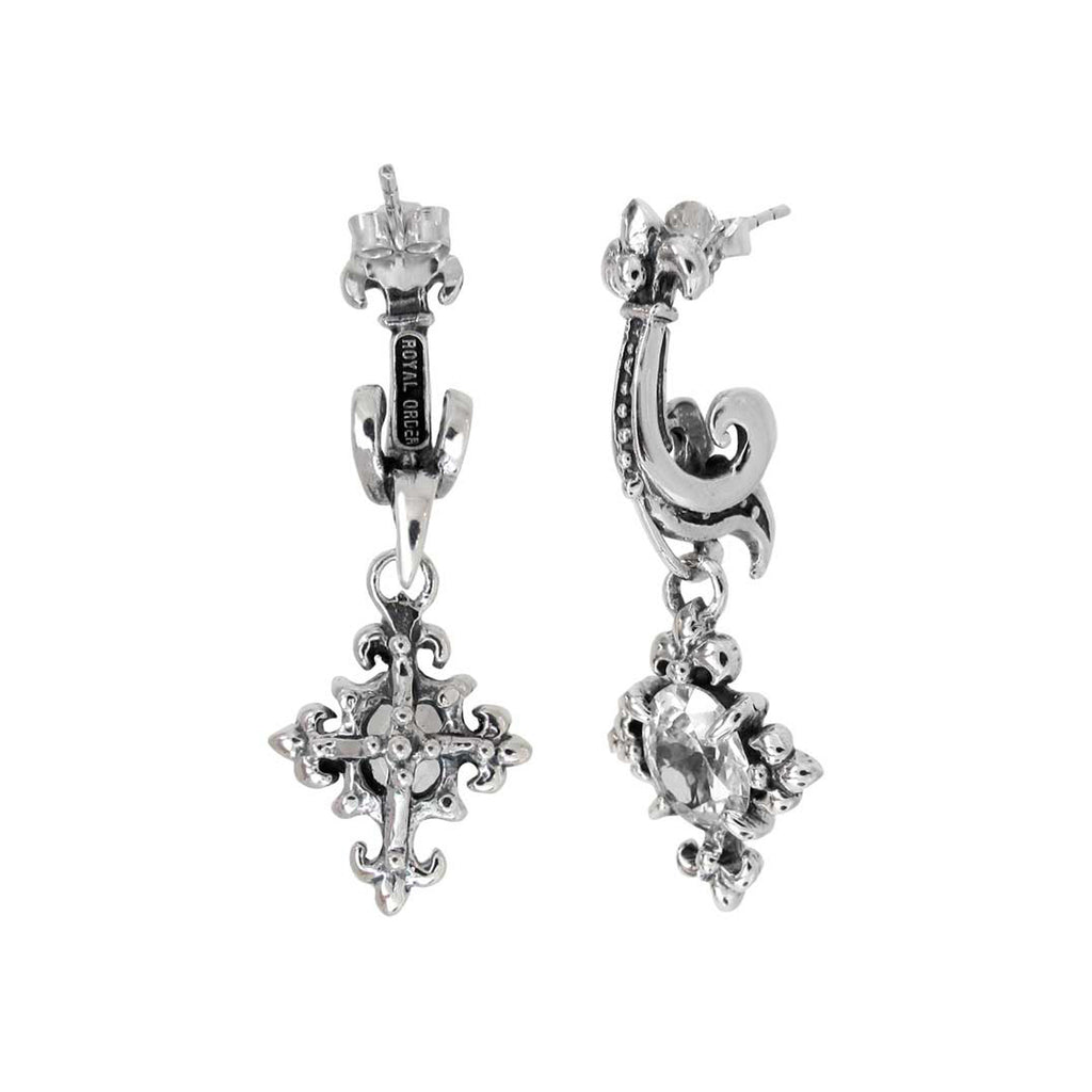 Pair of ornate drop earrings with a Fleur de Lis design securing a cubic zirconia stone.