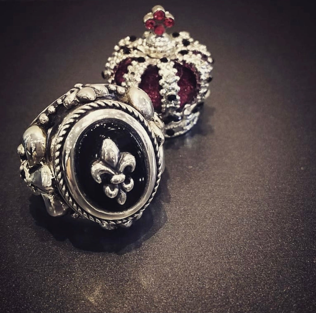This beautifully crafted ring features distinctively detailed Fleur de Lis sides set with cubic zirconia centers and a pretty crown detail on the Onyx center emblem. Alternative choices offer a center Fleur de Lis or a tiny Skull