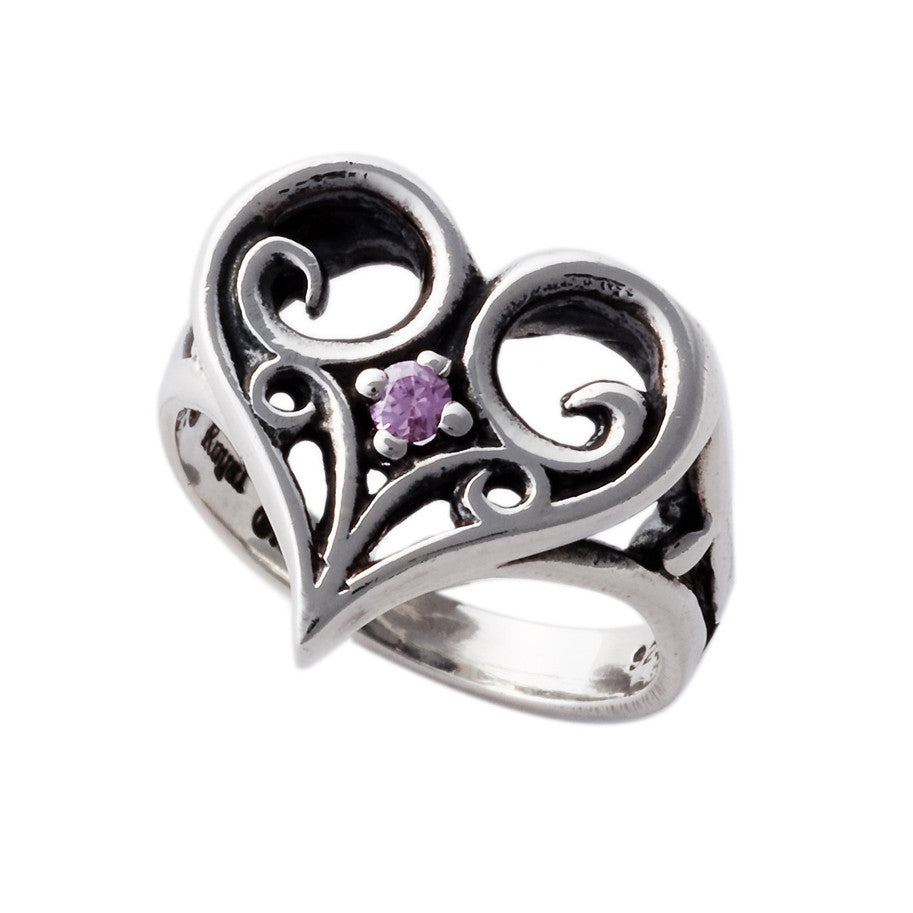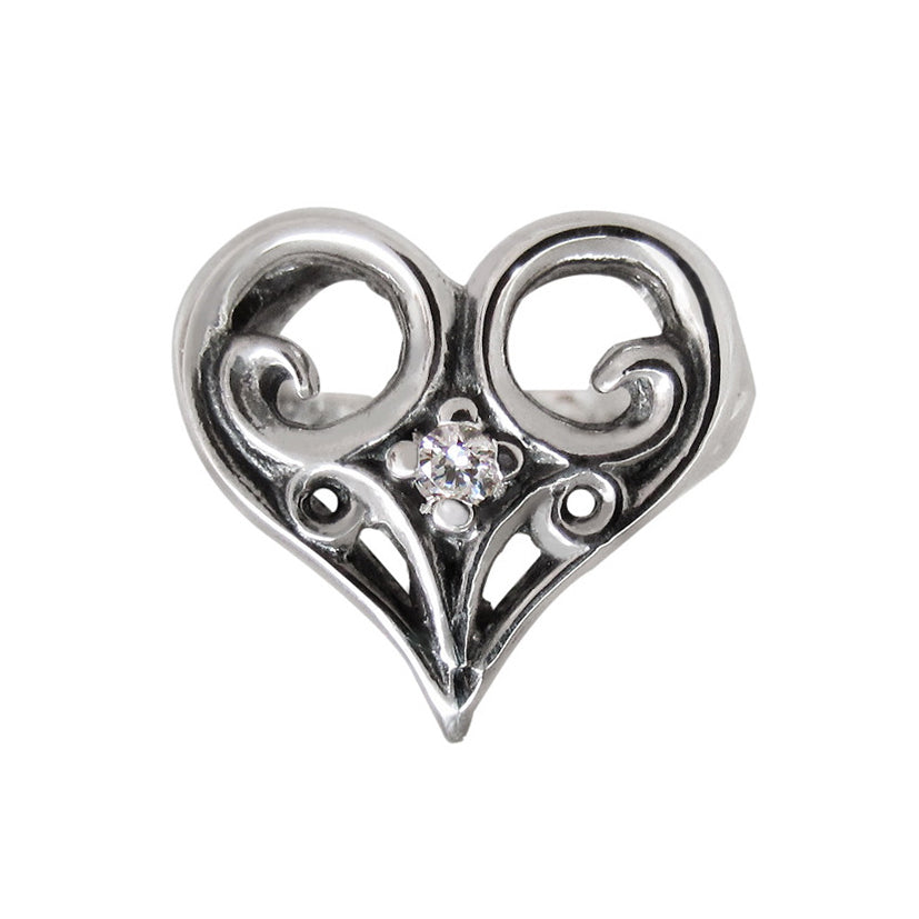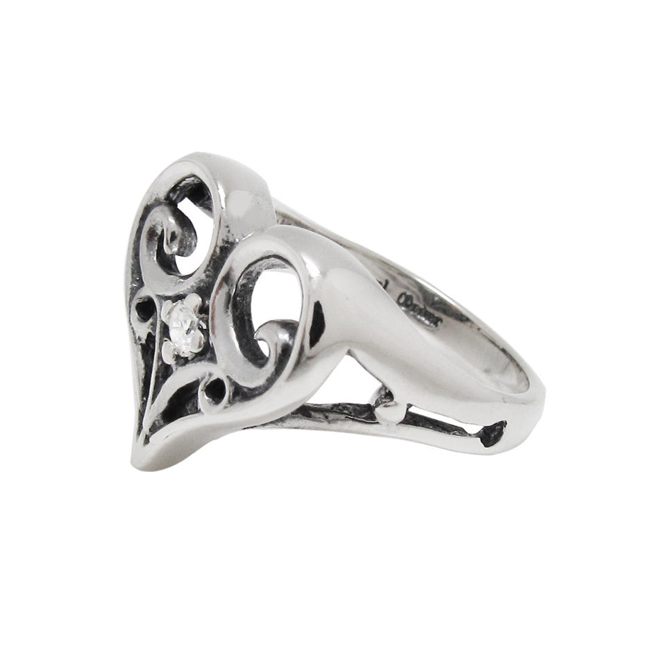 A delicate heart design with a cubic zirconia stone in the center, and small cut outs on band.