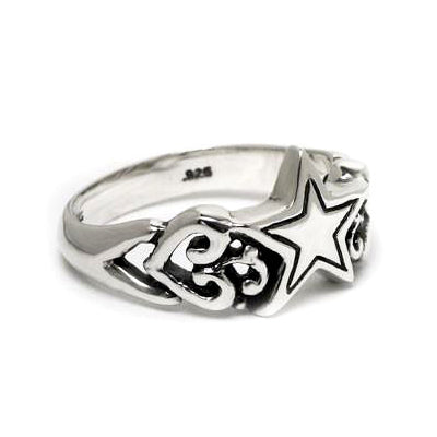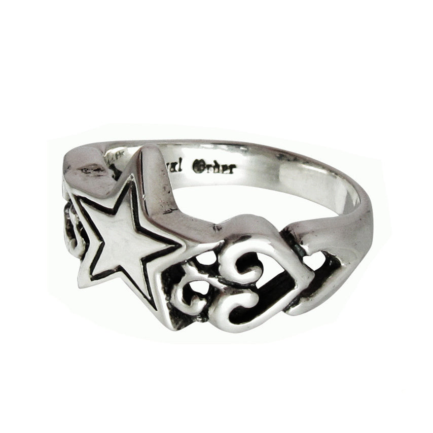 Delicate star on a silver Royal Order allegra heart band featuring one center star and two Allegra hearts on the sides of the band.