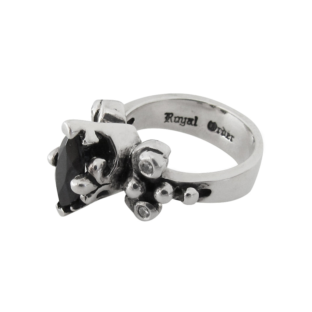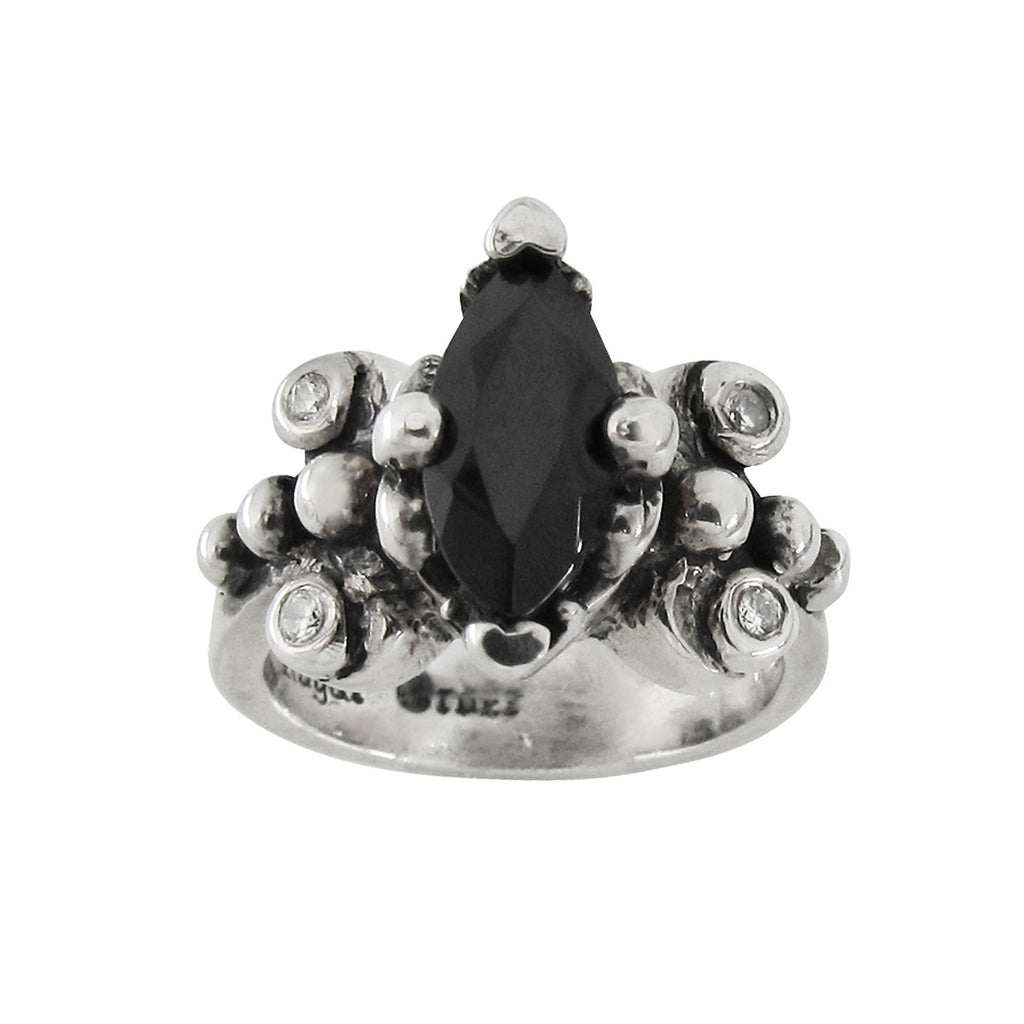 Marquise cubic zirconia center stone surrounded by four clear cubic zirconia stones.