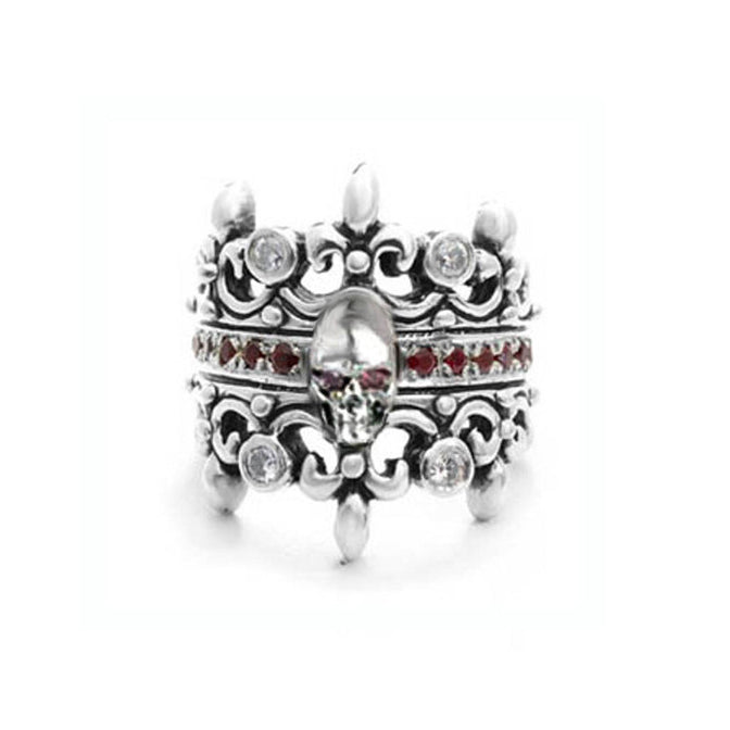 Double tiara ring with petite skull centerpiece. Diamonds set on the tiara. Available with a ruby or sapphire band.