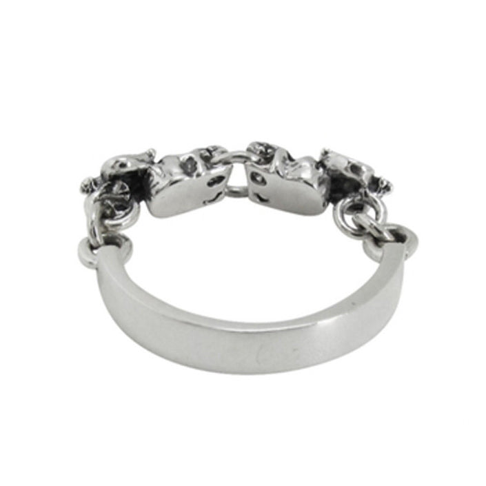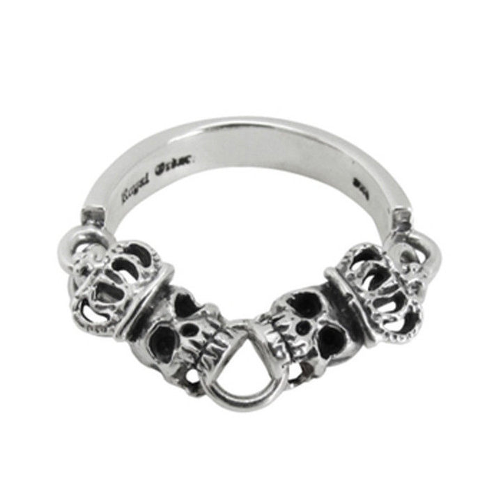 Two tiny crowned skulls connected to a silver band via jump rings.