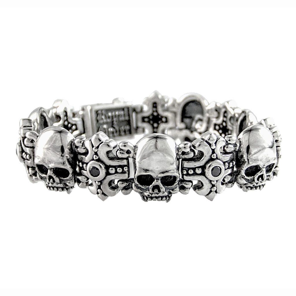 Small skull and cross trellis bracelet set with cubic zirconia stones and a secure box clip.