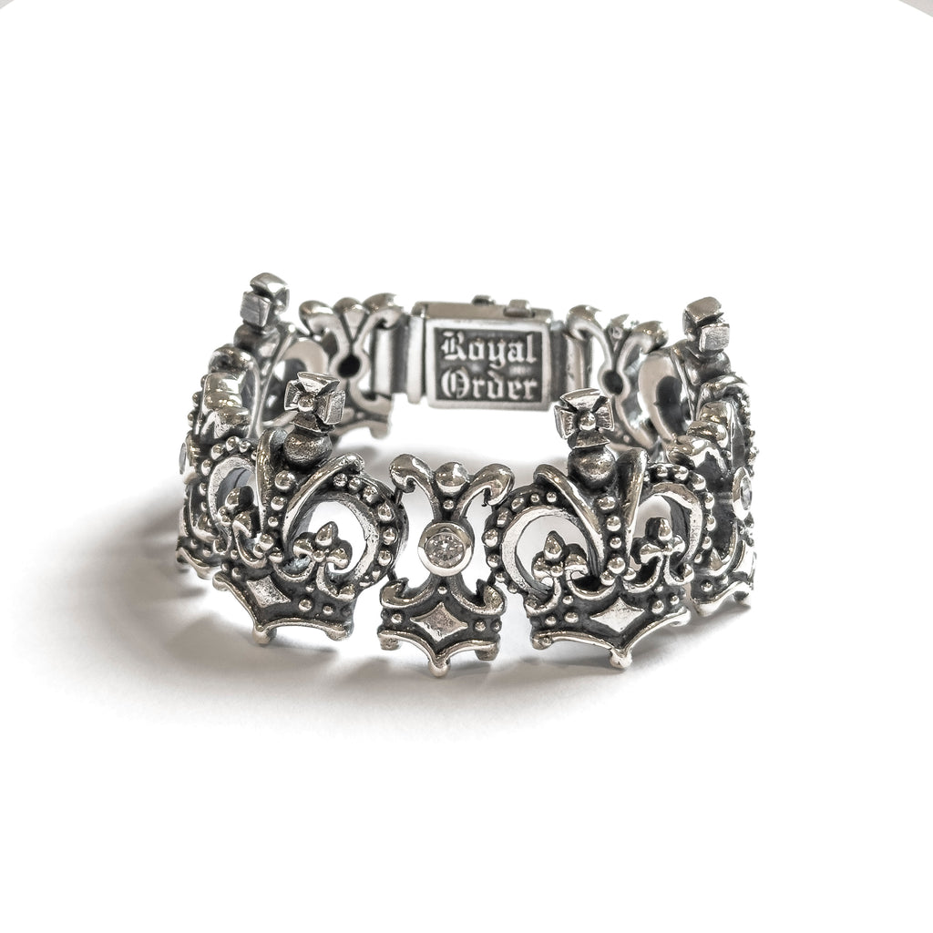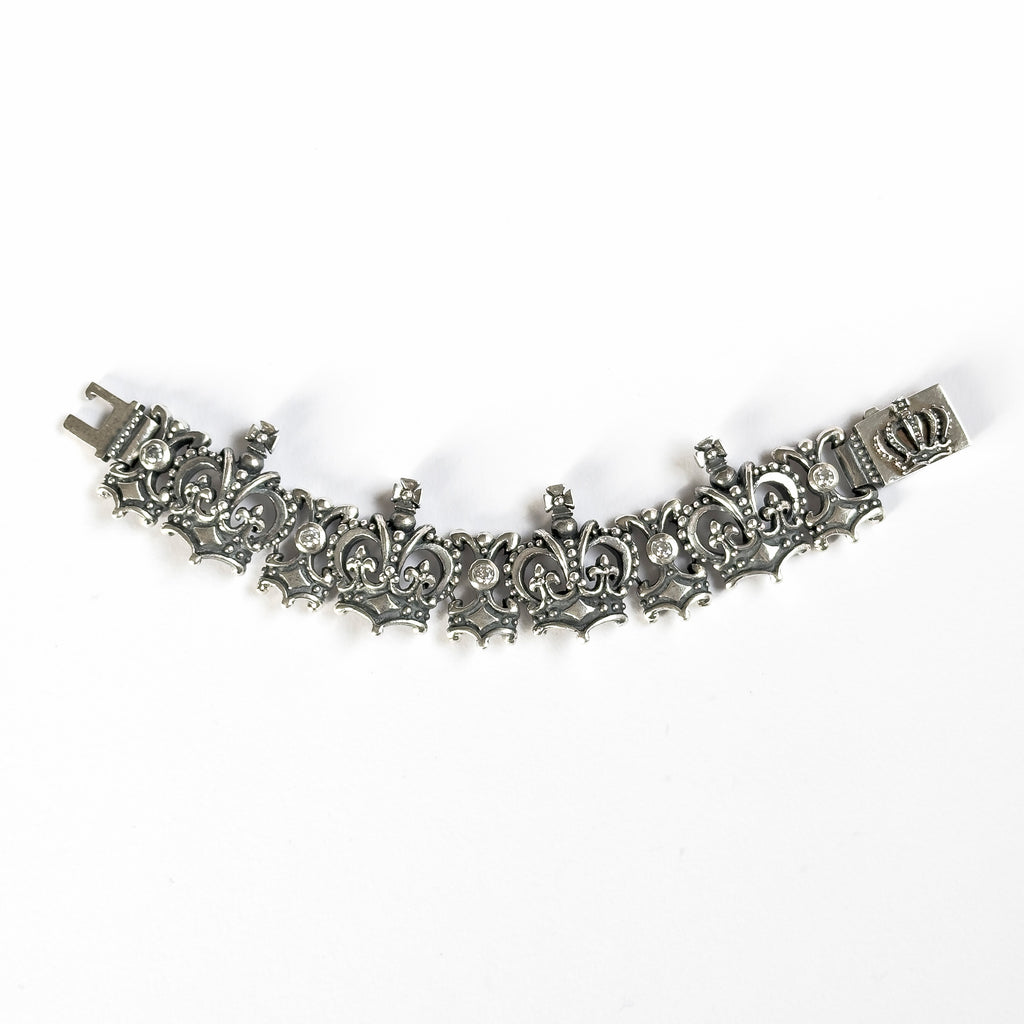 Queen crowns connected by fleur des lis links. Cubic zirconia stones are set throughout the bracelet and the Royal Order crown box clip clasp keeps it secure.