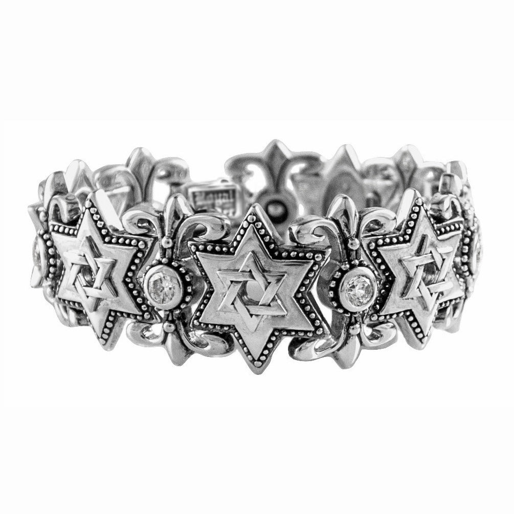 Ornate Stars of David connected by fleur des lis links. Cubic zirconia stones are set throughout the bracelet and the Royal Order crown box clip keeps it secure around the wrist.